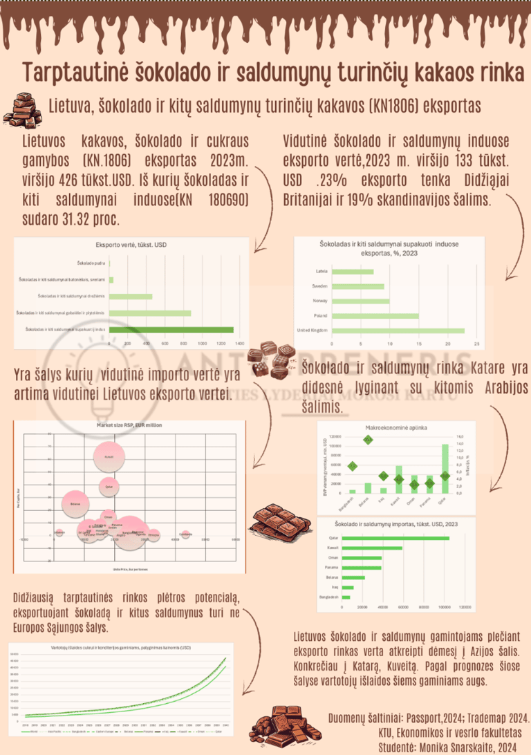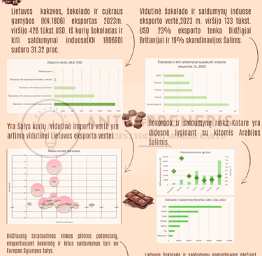 Šiame darbe analizuojama Lietuvos šokolado ir saldumynų (KN1806) eksporto situacija 2023 m., pagrindiniai eksporto partneriai bei potencialios augimo rinkos. Infografiko pagrindu atlikta analizė parodė, kad: