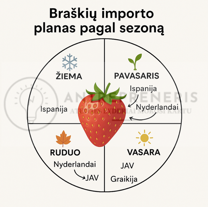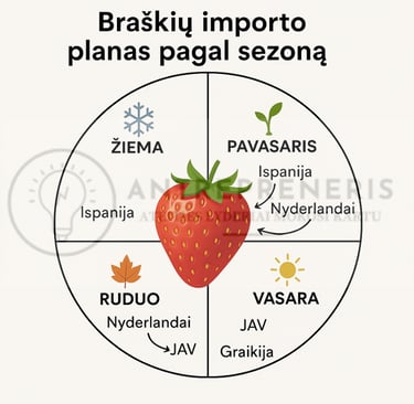 Ispanija, Meksika ir JAV yra stabiliausi braškių tiekėjai pasaulyje, o Nyderlandai išsiskiria eksporto verte. Tyrimas taip pat atskleidžia, kaip sezoniniai svyravimai daro įtaką braškių pasiūlai – pavasarį dominuoja Ispanija, vasarą – JAV, o rudenį – Nyderlandai. Remiantis šiais duomenimis, pateikiamas metinis braškių importo planas į Lietuvą pagal optimalų šaltinį kiekvienam mėnesiui.