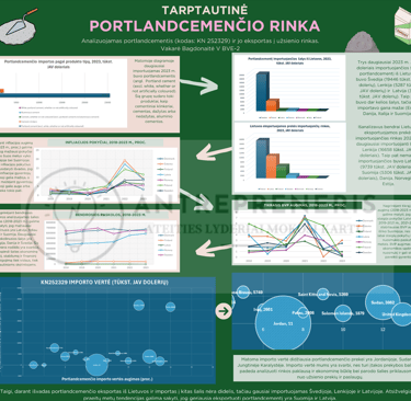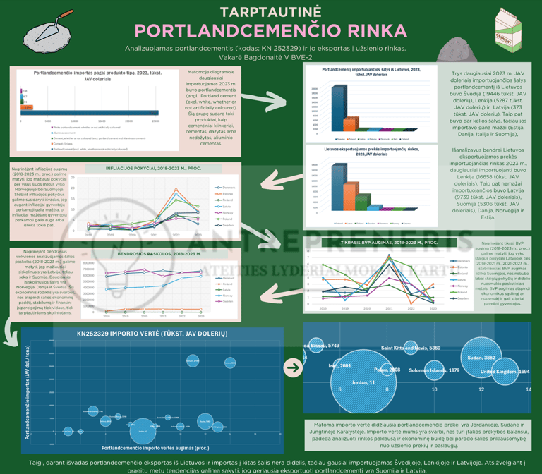 Šiame darbe analizuojama Lietuvos portlandcemenčio (KN252329) eksporto ir importo situacija 2023 m., pagrindinės partnerių šalys bei ekonominiai veiksniai, galintys turėti įtakos rinkos plėtrai. Infografiko pagrindu atlikta analizė parodė, kad: